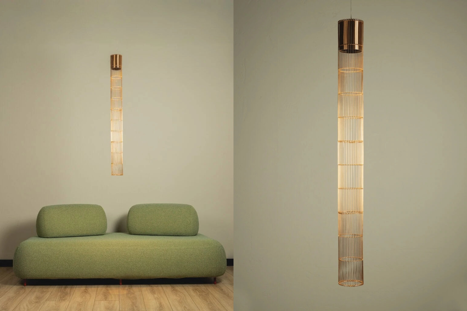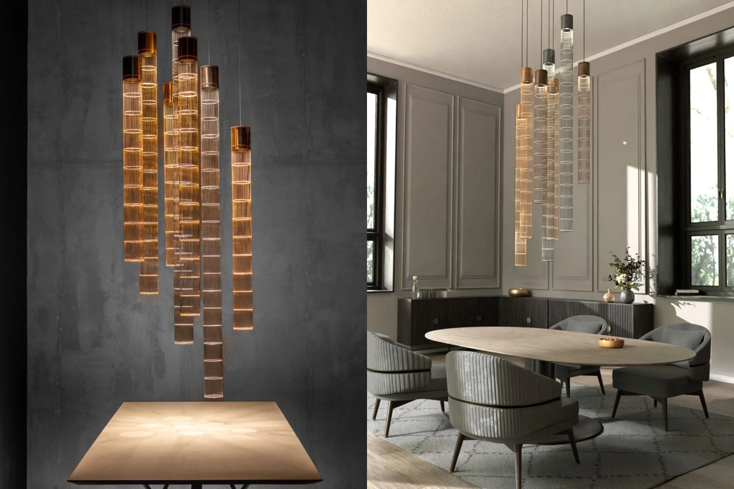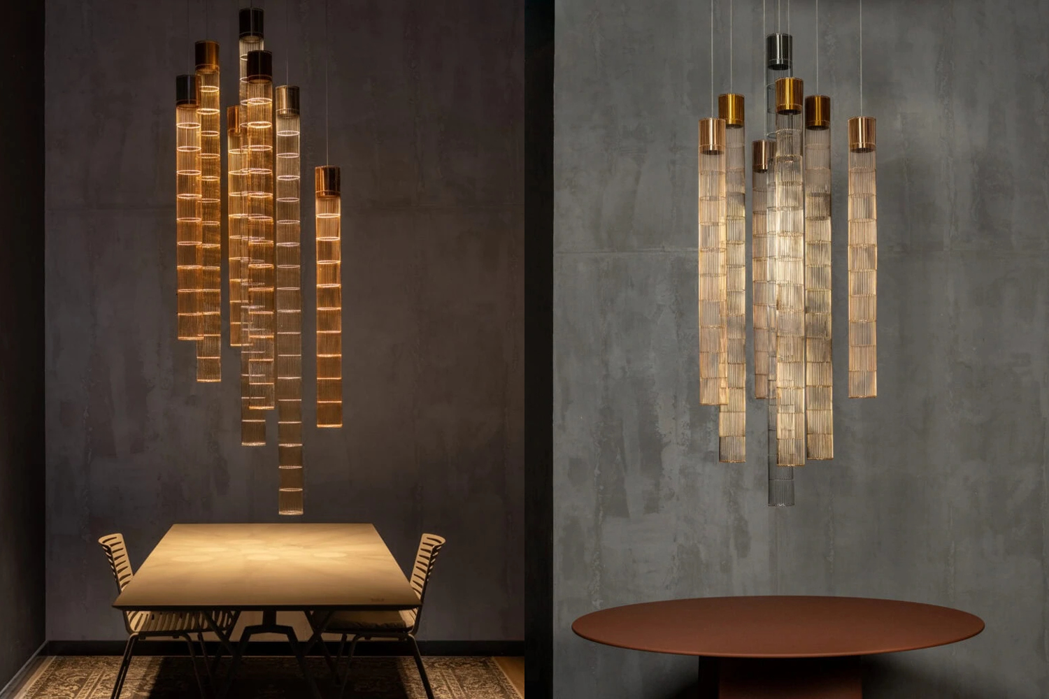An avant-garde form of lighting inspired by the cosmic harmony of stars. Its slender silhouette and subtle light evoke the trails of falling comets. A metal mesh and aluminum shade create a modern composition. Celestia works as a striking solo accent, while combining multiple units allows for the creation of luminous constellations inspired by the motion of celestial bodies. The fusion of light and form enhances spatial depth, adding a touch of dynamism to the interior.